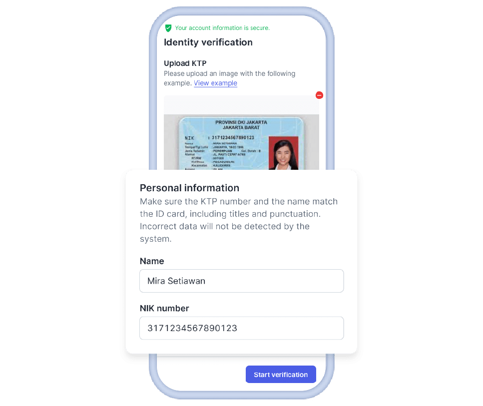 It’s safe because the verification process uses your data at Dukcapil, so the results are accurate. In addition, the electronic identification process follows high-security rules according to AML5 (Fifth Anti-Money Laundering Directive) and eIDAS (electronic Identification, Authentication, and Trust Services).