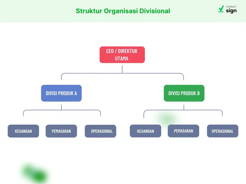 Organisasi dibagi berdasarkan produk, wilayah, atau segmen pasar. Setiap divisi memiliki tim pemasaran, keuangan, dan operasional sendiri. Dengan model ini, setiap divisi dapat lebih fokus pada target pasar masing-masing.