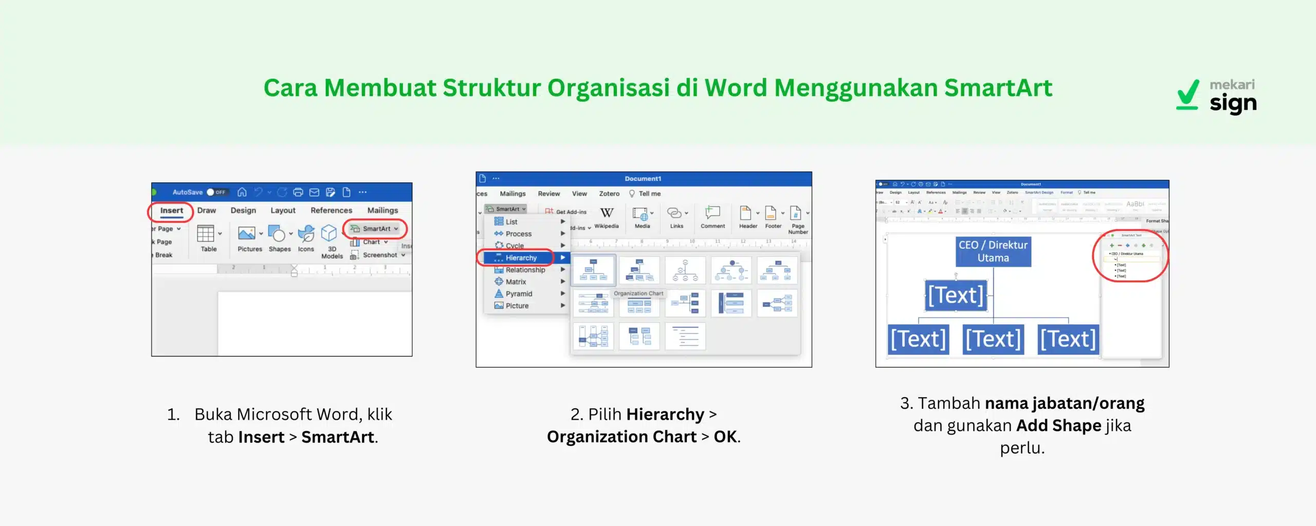 Setelah memahami berbagai jenis struktur organisasi, sekarang saatnya untuk belajar bagaimana cara membuatnya di Word. Microsoft Word menyediakan dua metode utama: menggunakan SmartArt untuk cara otomatis atau Shapes untuk cara manual.
