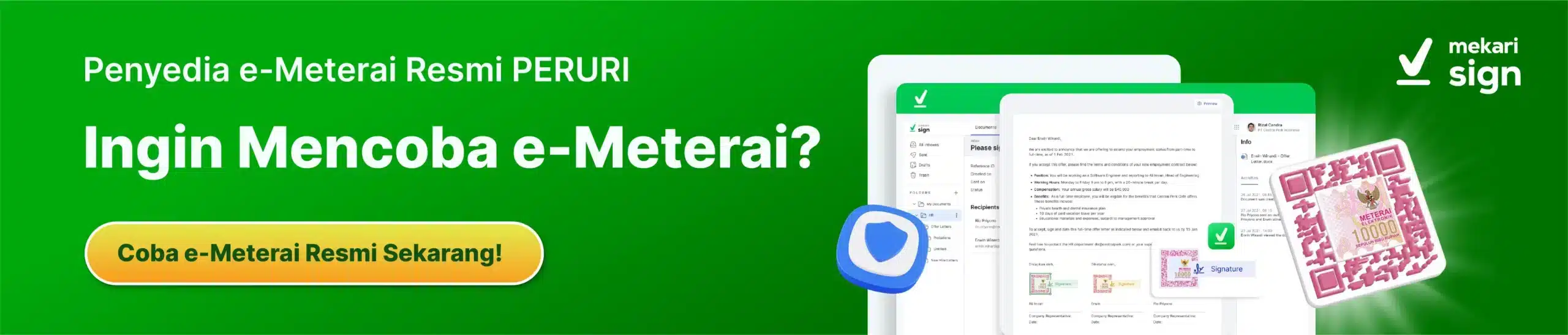 Untungnya, Anda bisa memanfaatkan layanan otomasi dokumen seperti Mekari Sign. Hanya perlu beberapa klik, maka kebutuhan dokumen waralaba Anda bisa dilakukan secara digital dan lebih praktis. Mulai dari digital signature Indonesia, hingga Meterai Elektronik tersedia di Mekari Sign. Yuk, coba!
