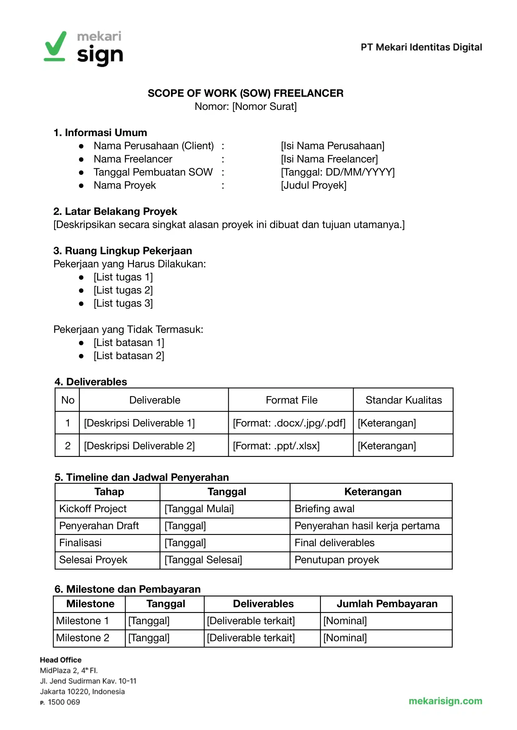 Dokumen Scope of Work, ketika dibuat dan disepakati secara sah oleh kedua belah pihak, baik melalui tanda tangan basah maupun digital, memiliki kekuatan hukum yang setara dengan kontrak kerja formal. Ini penting terutama dalam kerja sama freelance yang sering kali tidak tercakup dalam struktur kerja tetap.