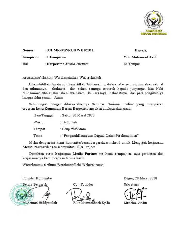 Contoh Surat Permohonan Kerjasama (Partnership)