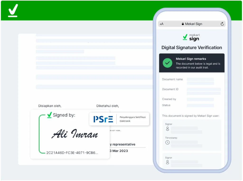 Solusi tanda tangan dan meterai elektronik Mekari Sign dijamin sah dengan sertifikasi resmi Indonesia dan global.