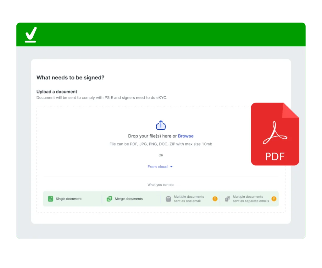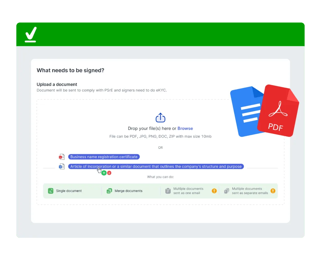 Unggah hingga 15 dokumen sekaligus, gabungkan atau kelola pengiriman sesuai kebutuhan, semua langsung dari satu dashboard tanpa aplikasi lain.